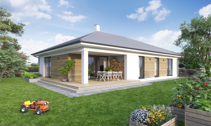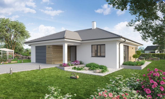 Jedná se o moderní přízemní dům s valbovou střechou.