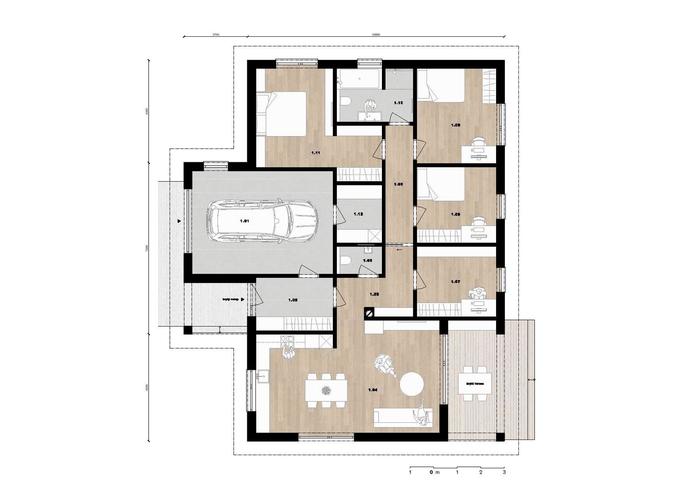 Dům je složen z hlavní obytné části, garáže a venkovních krytých částí vstupu a terasy.