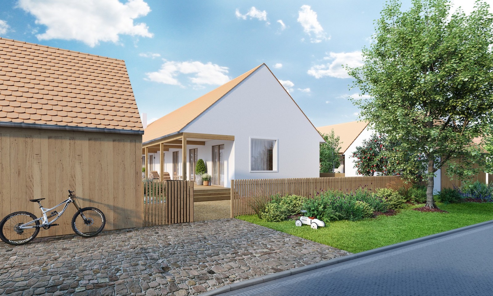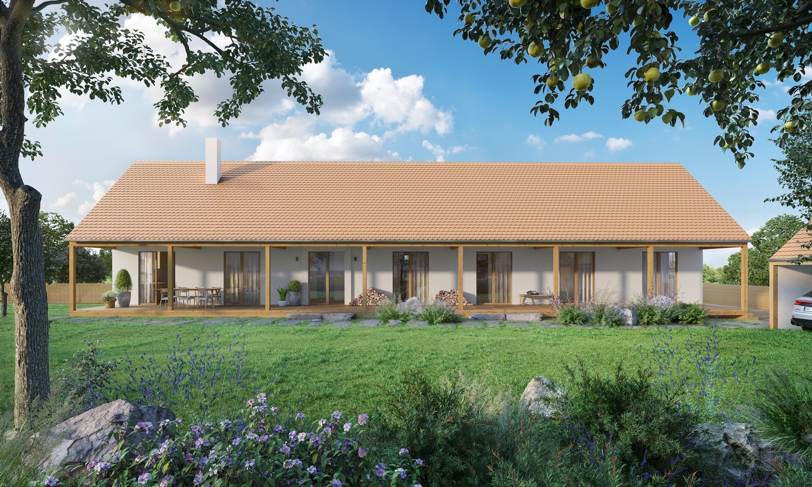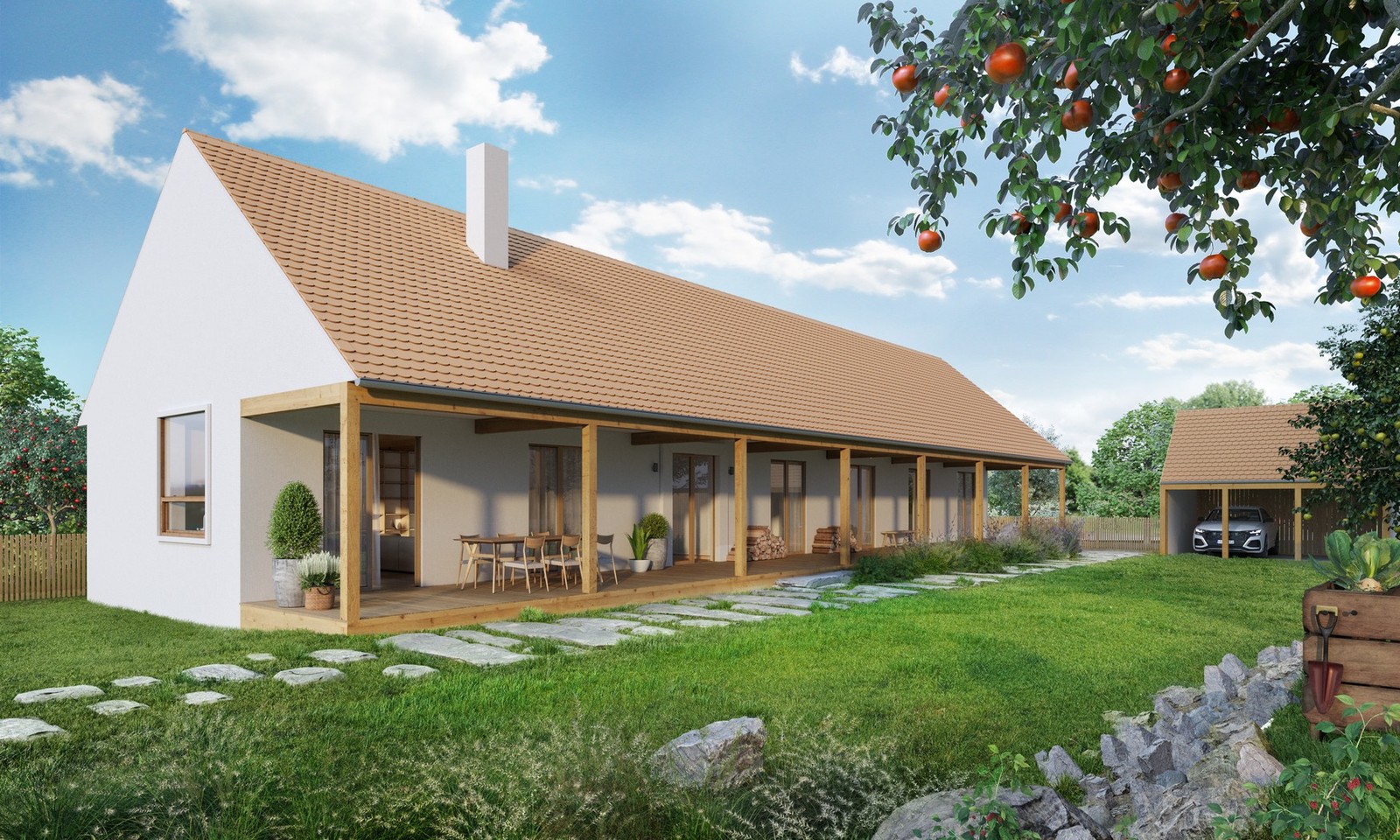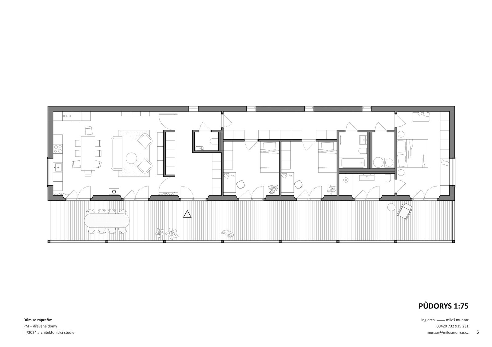 Jednoduchý lineární objekt se sedlovou střechou určený na lánové typy pozemků, horské enklávy či specifické pozemky nově zastavovaných území. Po celé délce domu je navrženo zápraží – tradiční prvek lidové architektury, který plnil praktický význam života na vsi – chránil před deštěm, ostrým sluncem, věšelo se zde prádlo, sušily se bylinky či cibuloviny.