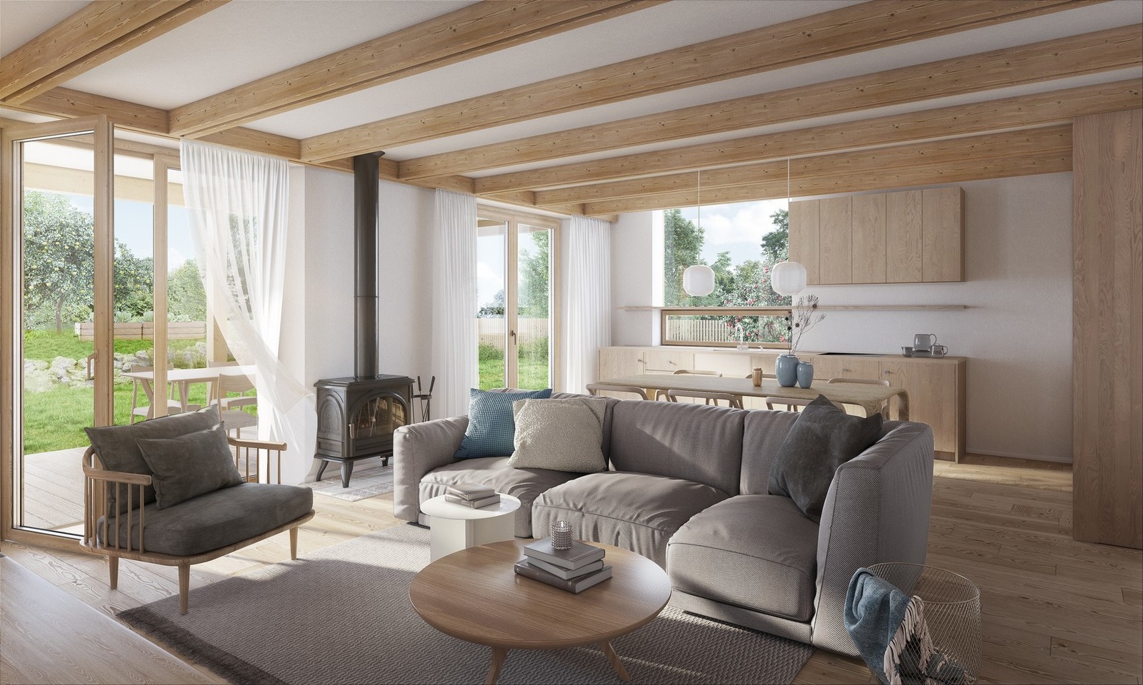 Tento jednoduchý princip zastřešené chodby se stal hlavní ideou celého domu. Všechny obytné místnosti mají přímý vstup na kryté zápraží sloužící jako pobytová plocha s přímou návaznosti na zahradu a fungující jako hlavní komunikace pro vstup do domu. Dispozičně je dům rozdělen na denní a noční zónu, které od sebe odděluje velkoryse navržený vstupní prostor.