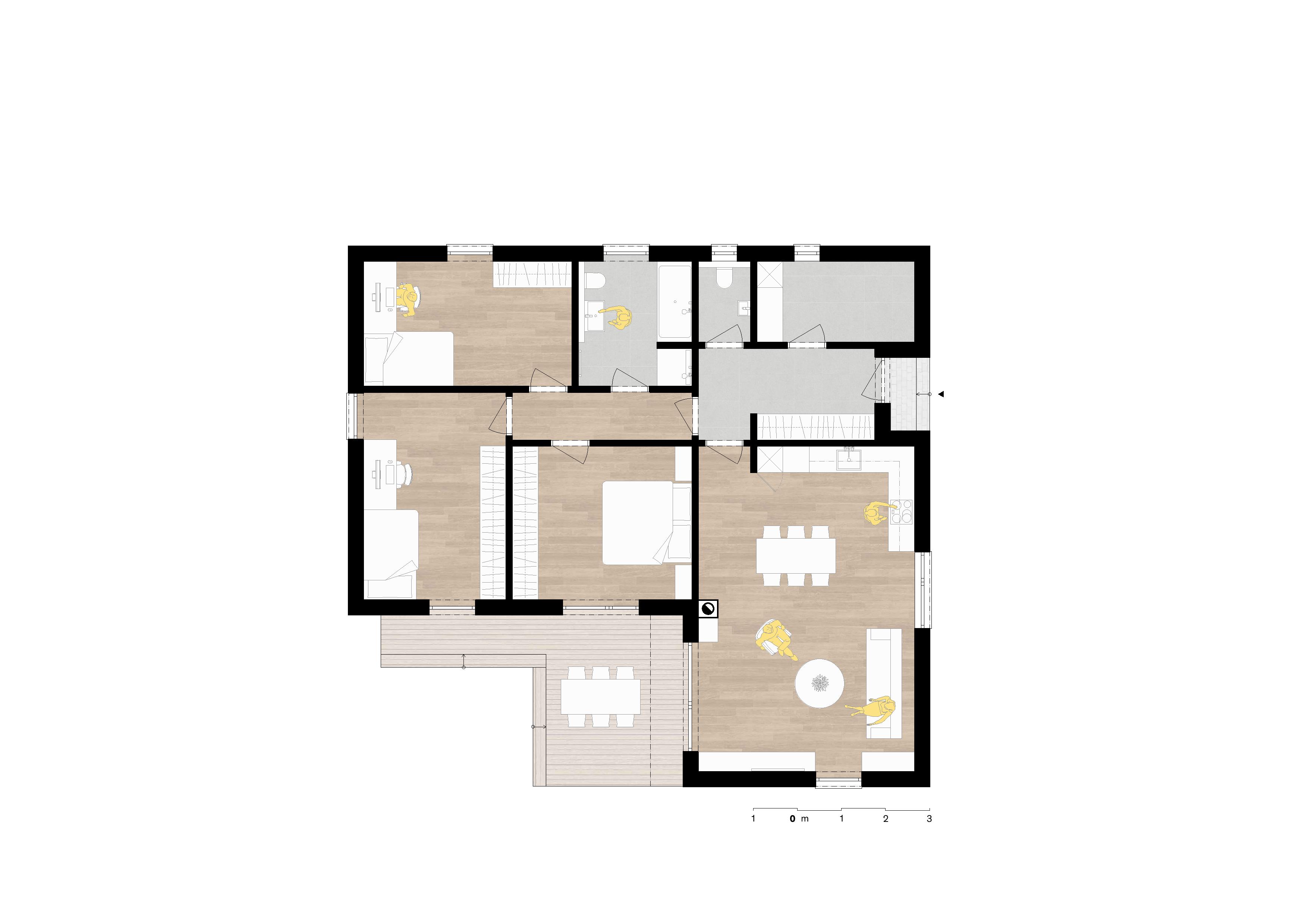 RD 103 je přízemní dům o půdorysu tvaru L. Toto řešení umožňuje oddělení veřejné části domu s hlavní obytnou místností od čistě soukromé části s ložnicemi. Zároveň toto řešení poskytuje příjemný venkovní prostor krytý ze 2 stran domem.