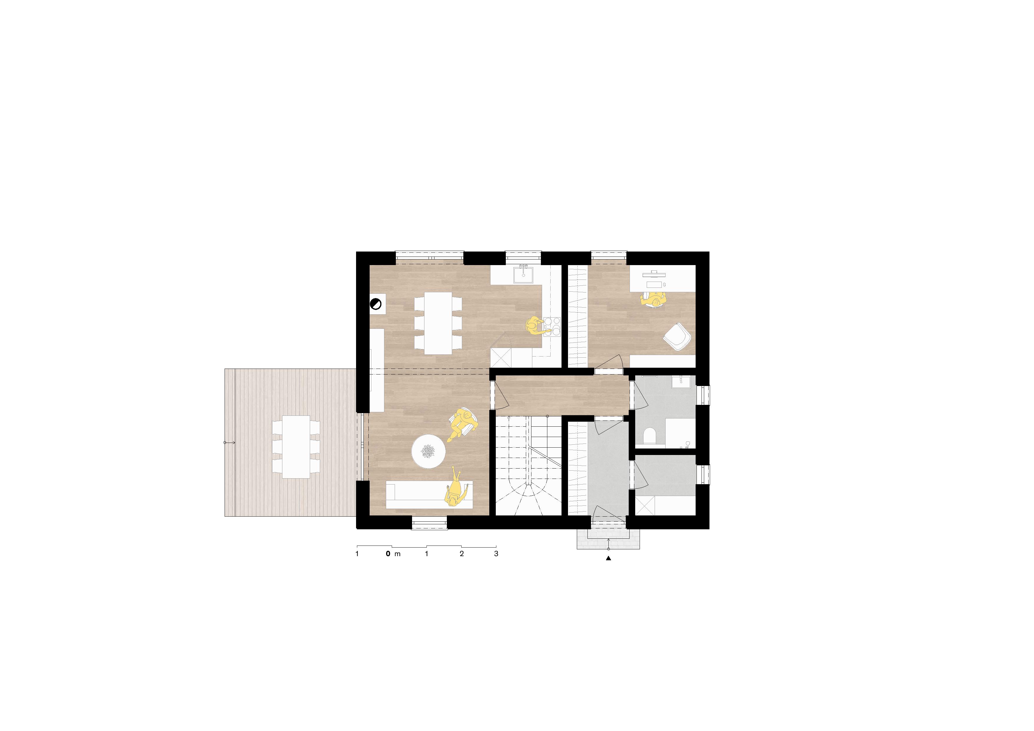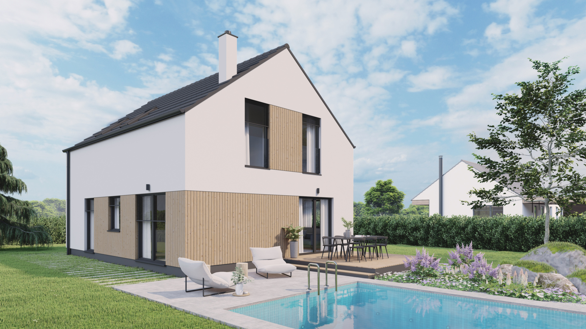 Jedná se o jednoduchý patrový dům s bočním vstupem, který i s malou zastavěnou plochu dokáže poskytnout dostatek prostoru pro komfortní bydlení velkých rodin. V přízemí se nachází zádveří, technická místnost, koupelna, pracovna a hlavní obytná místnost, na kterou navazuje venkovní terasa. V podkroví je ložnice, 2 pokoje, šatna a koupelna.