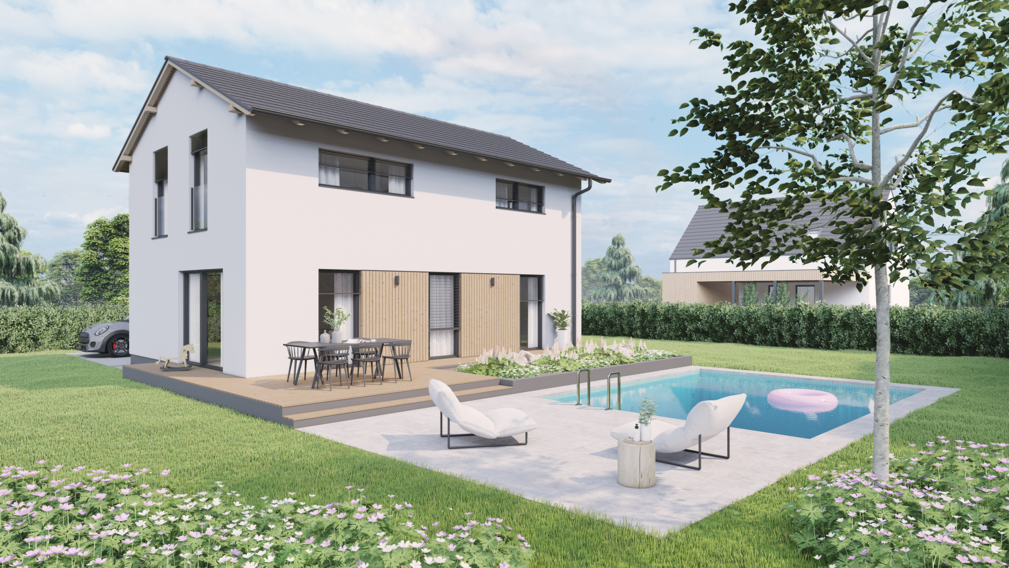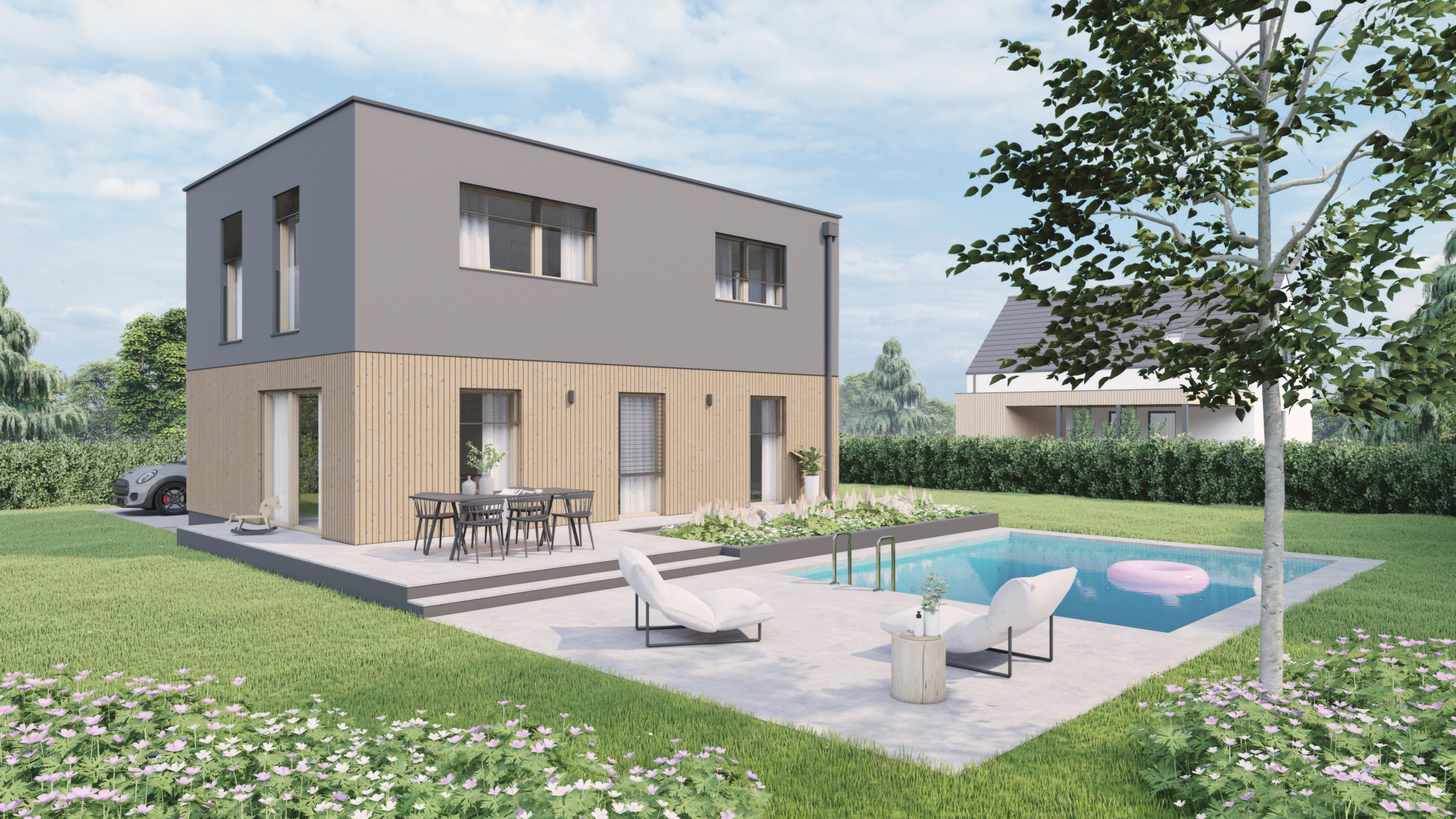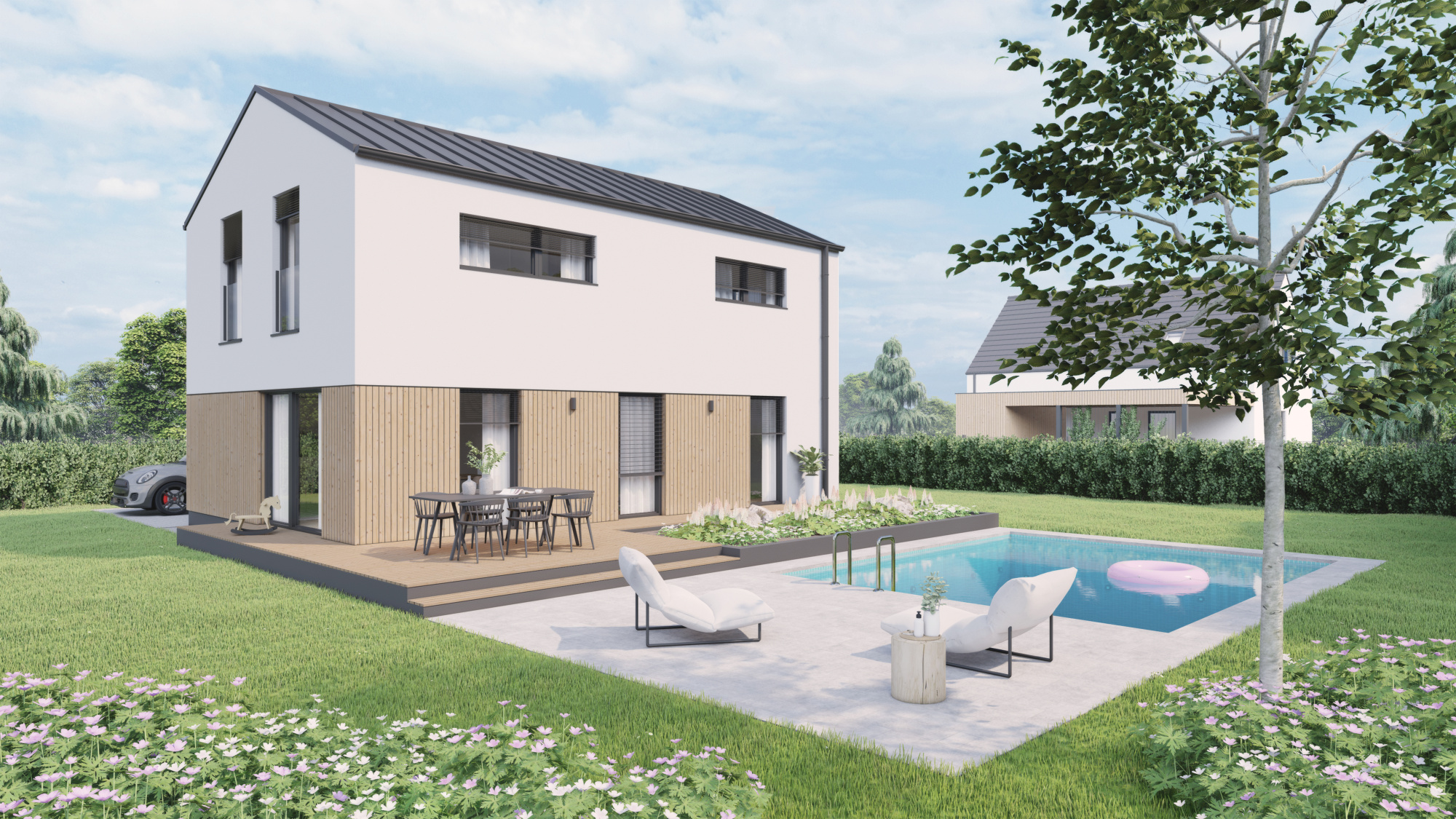 Akční bonusy u domů: ZDARMA projektová dokumentace, stavební povolení, komín, blower-door test, bleskosvod (bleskosvod a čidla proti vlhkosti nejsou u provedení OPTIMAL), tepelné čerpadlo (voda – vzduch)
