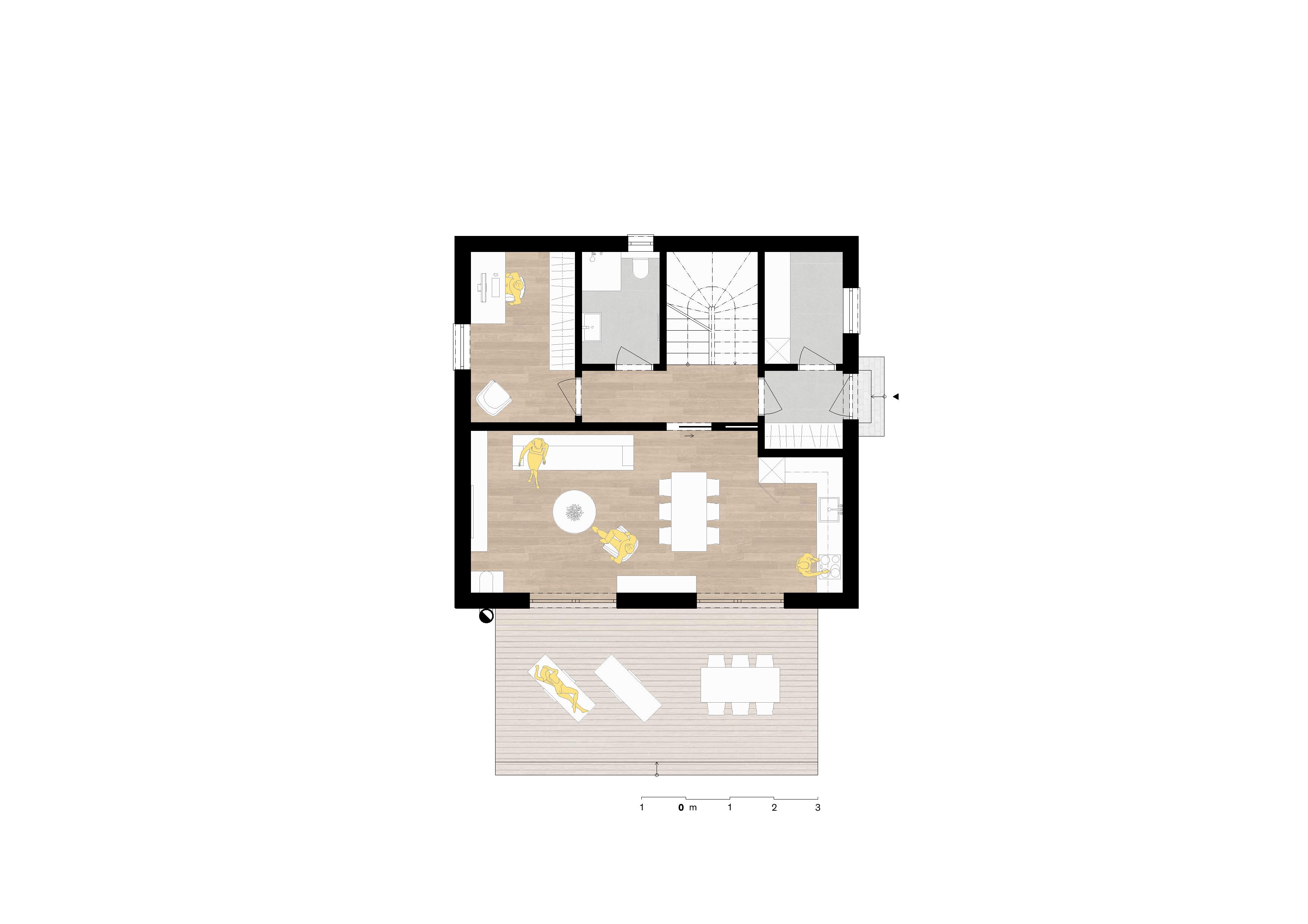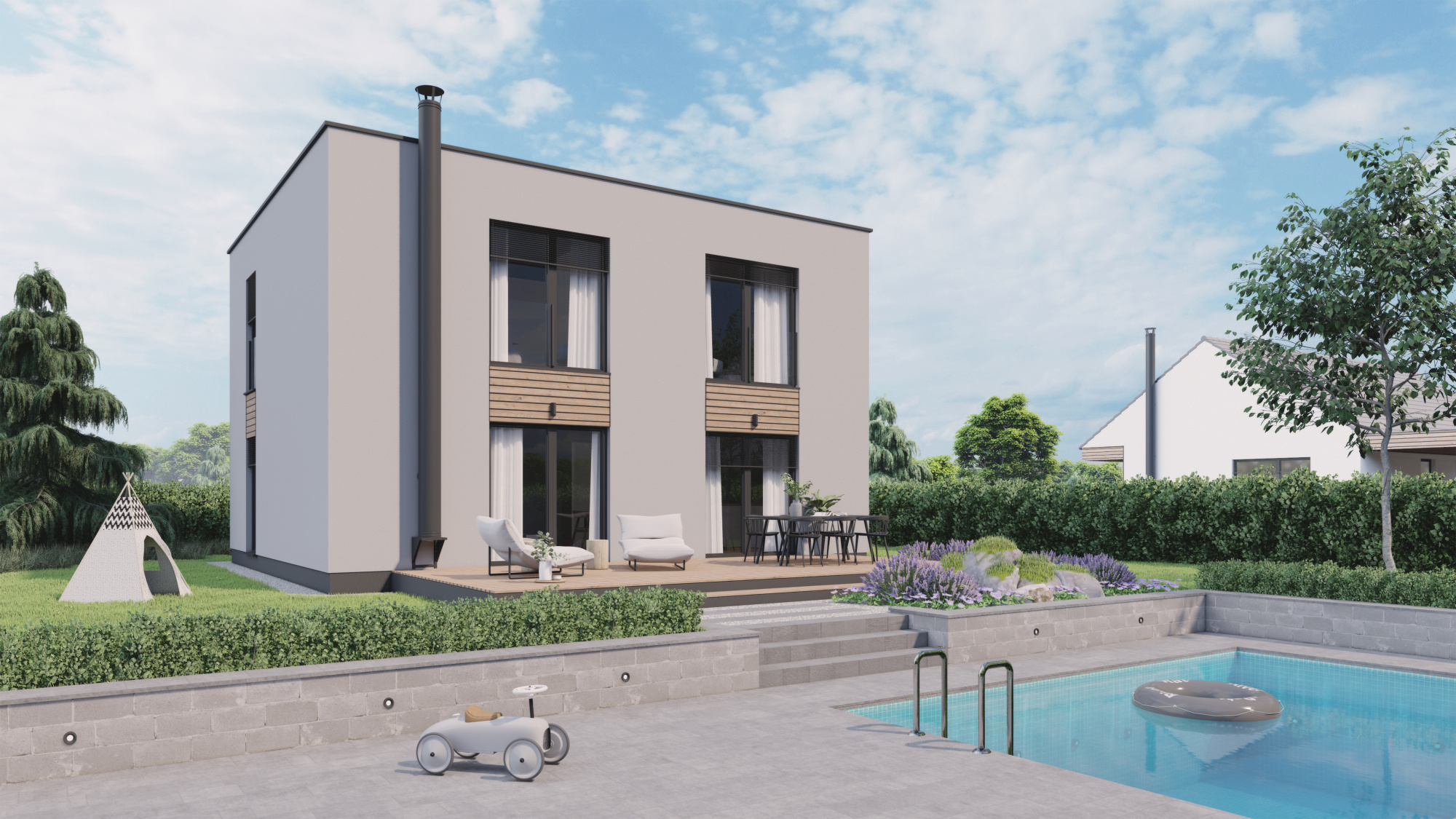 Jedná se o patrový dům s dispozici 5+kk. Hlavní výhodou tohoto domu je plnohodnotně využitelné podkroví v celé ploše. V přízemí se nachází zádveří, technická místnost, koupelna, pracovna a hlavní obytná místnost, na kterou navazuje venkovní terasa. V podkroví je ložnice, 2 pokoje, koupelna a samostatná toaleta.