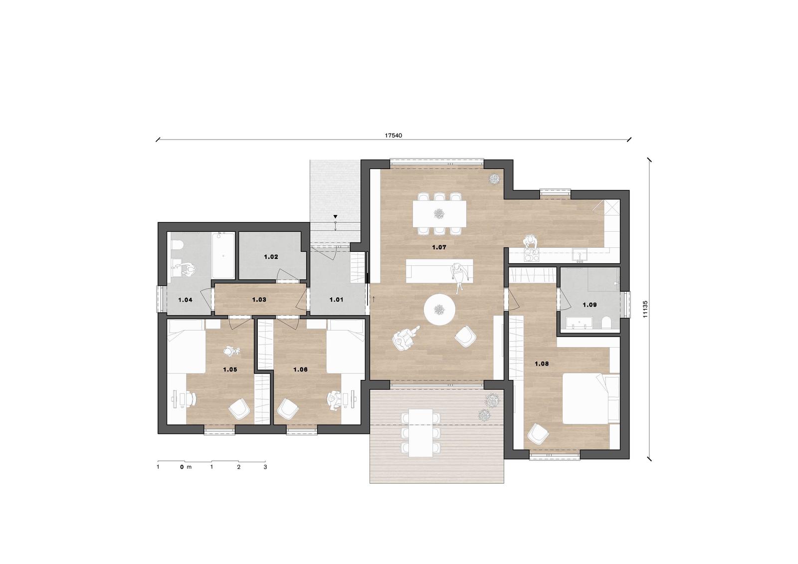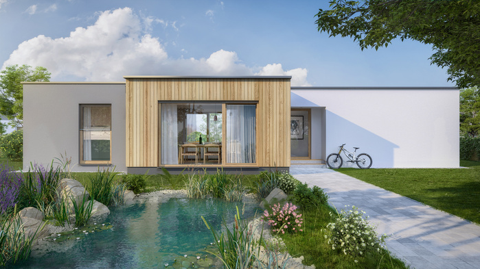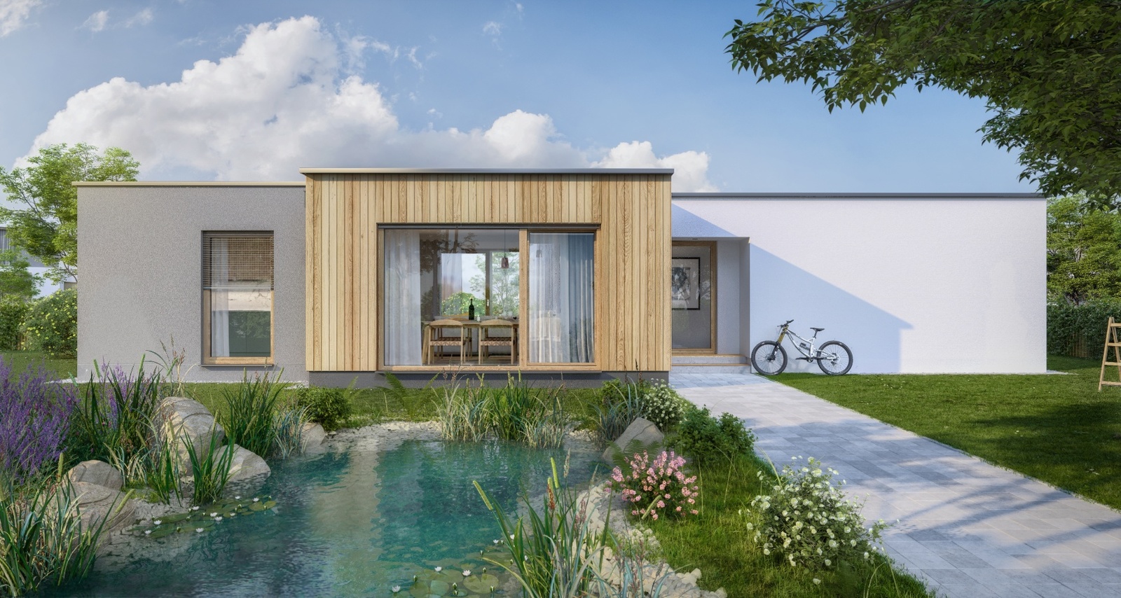Jedná se o moderní přízemní dům, který je hmotově složen ze 3 kvádrů. Toto hmotové uspořádání umožňuje rozdělení domu na 3 funkční části. Vstupní prostor se zázemím domu a dětskými pokoji, hlavní obytnou místnost, která se nachází v prostřední části a ložnici s koupelnou. Při navrhování byl kladen důraz na propojení všech obytných místností se zahradou.