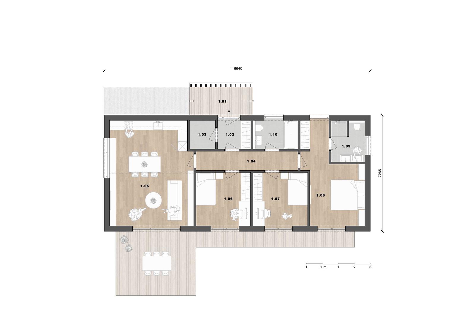 Jedná se o jednoduchý moderní přízemní dům. Hmotově dům odkazuje na tvar klasické české stodoly. Při navrhování byl kladen důraz na propojení všech obytných místností se zahradou.