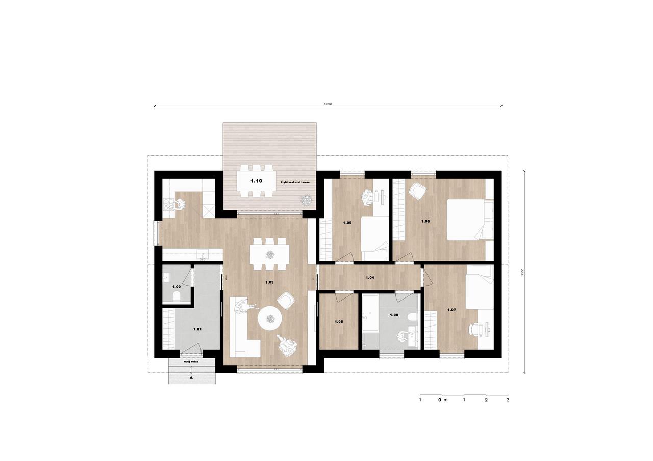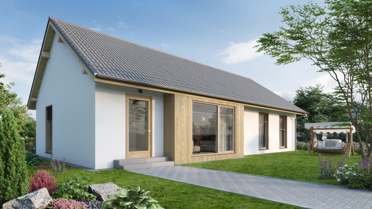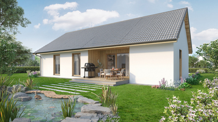 Jedná se o jednoduchý přízemní dům podélného tvaru, který je zastřešen sedlovou střechou s přesahy. Vnitřní dispozice domu je rozdělena na 2 části s důrazem na oddělení veřejné části se vstupem, toaletou a hlavní obytnou místností s navazující venkovní krytou terasou a soukromé části s ložnicemi a koupelnou.