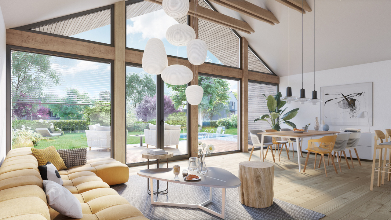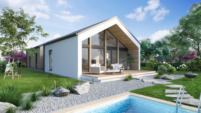 Jedná se o přízemní dům se šikmou střechou, jehož nejvýraznějším prvkem je celoprosklený štít. Hmotově je dům složen ze 3 částí. To se odráží i do vnitřní dispozice, kde je veřejná část domu s hlavní obytnou místností oddělena od soukromé části s ložnicemi pomocí komunikačních prostor.