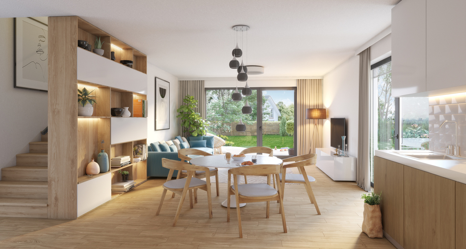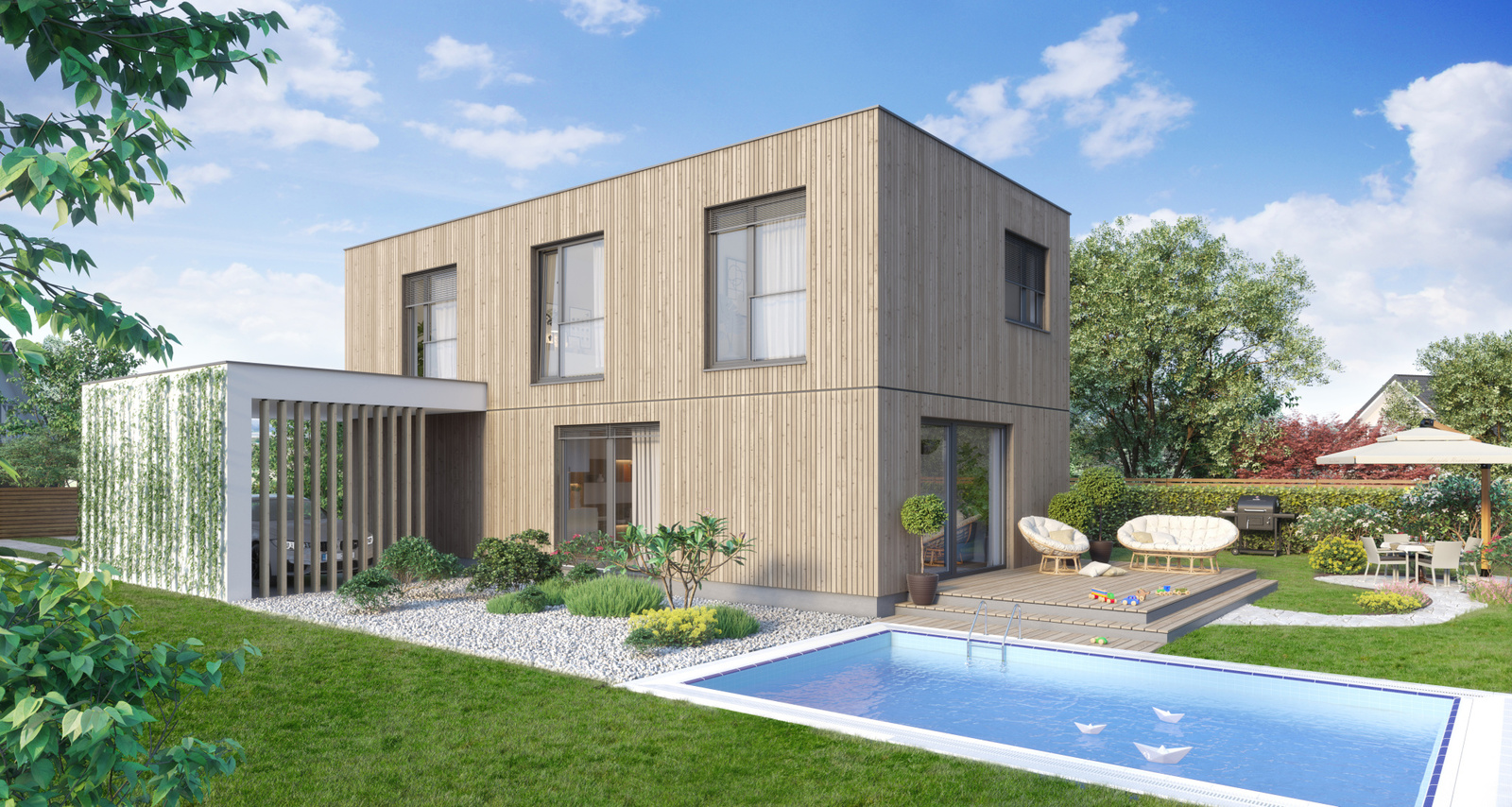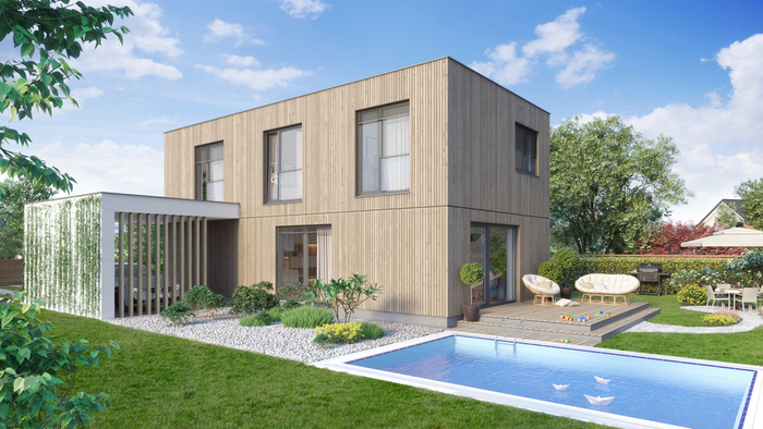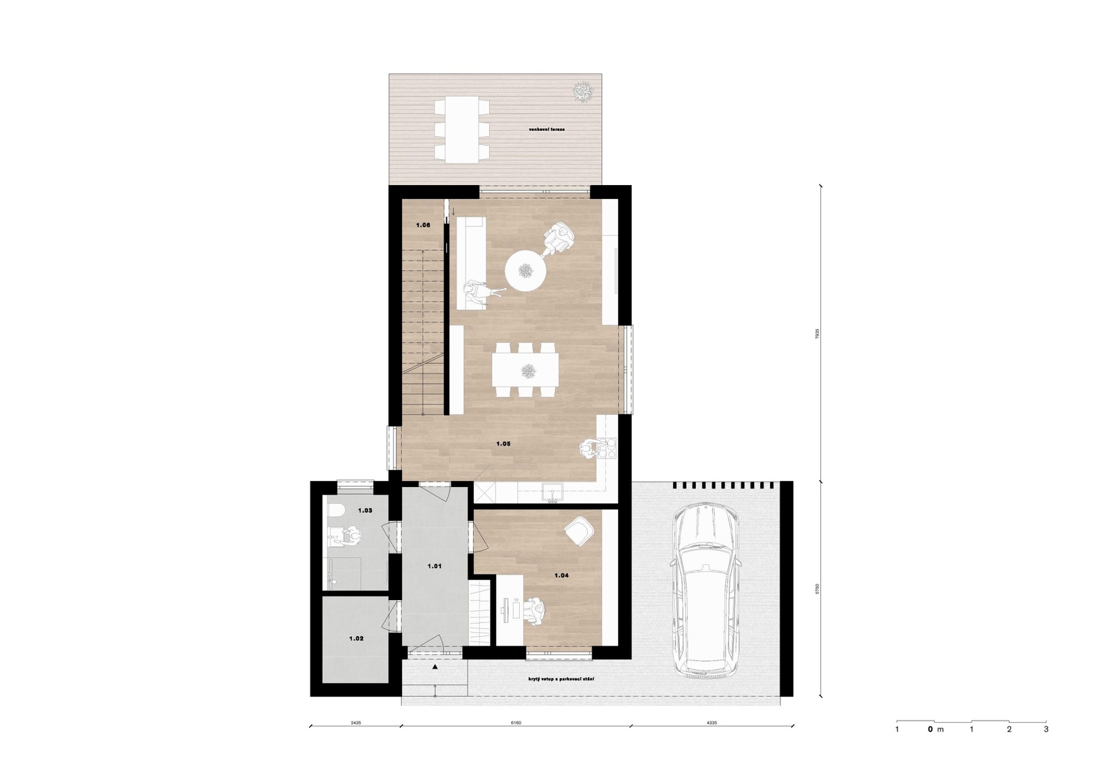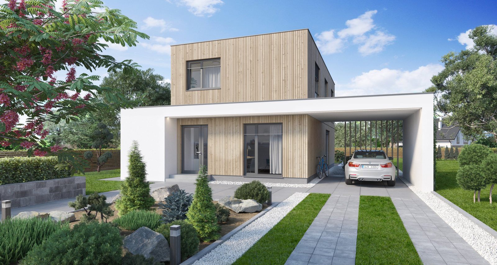 Jedná se o patrový dům, který je hmotově tvořen průnikem 2 kvádrů. Tyto kvádry jsou materiálově odlišeny. V přízemí domu se nachází kryté parkovací stání, krytý vstup se zádveřím, pracovna, hlavní obytná místnost, koupelna, technická místnost a schodiště. Ve 2.NP jsou 2 pokoje, ložnice a koupelna. Dům je navržen tak, aby mohl být použit i jako dvojdům, případně jako řadový dům.