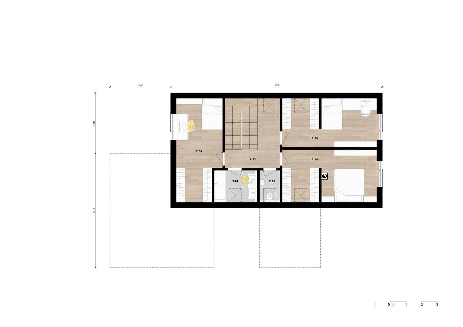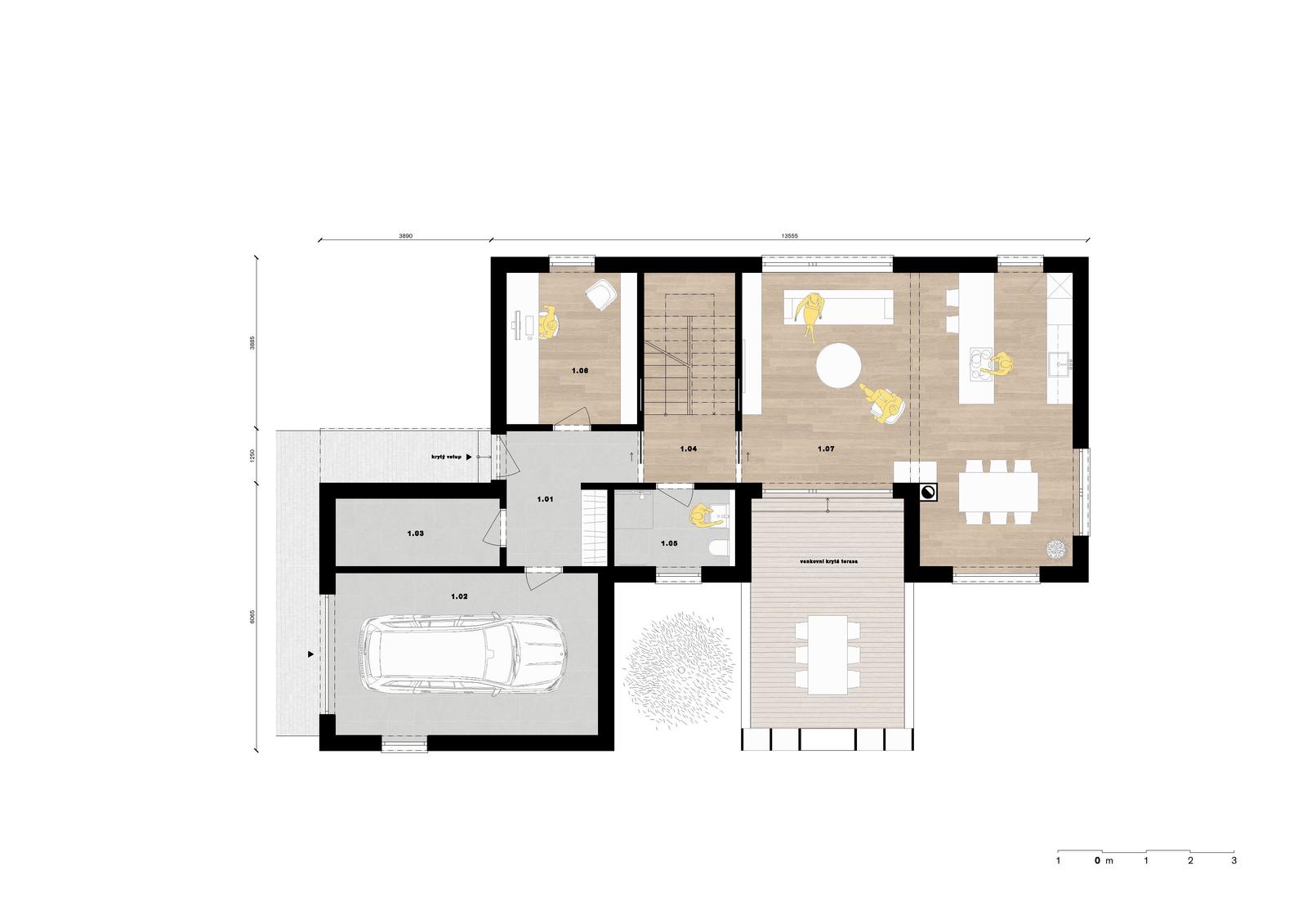 Jedná se o tvarově jednoduchý patrový dům, který je hmotově tvořen hlavní hmotou domu s obytnou částí, garáží a krytou terasou. V přízemí domu se nachází zádveří, garáž, pracovna, hlavní obytná místnost, toaleta, technická místnost a schodiště. V podkroví jsou 2 pokoje, ložnice, koupelna a samostatná toaleta.