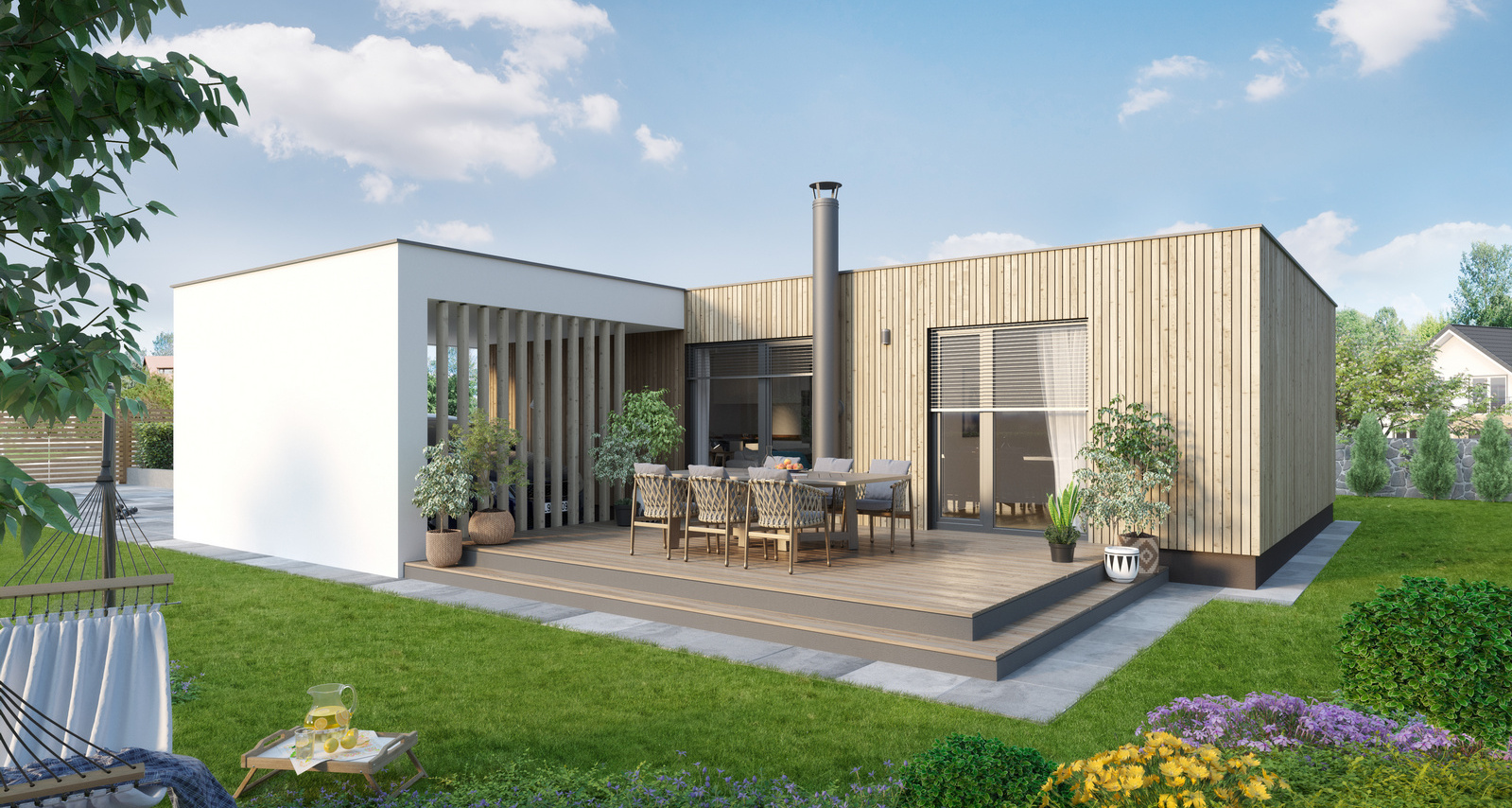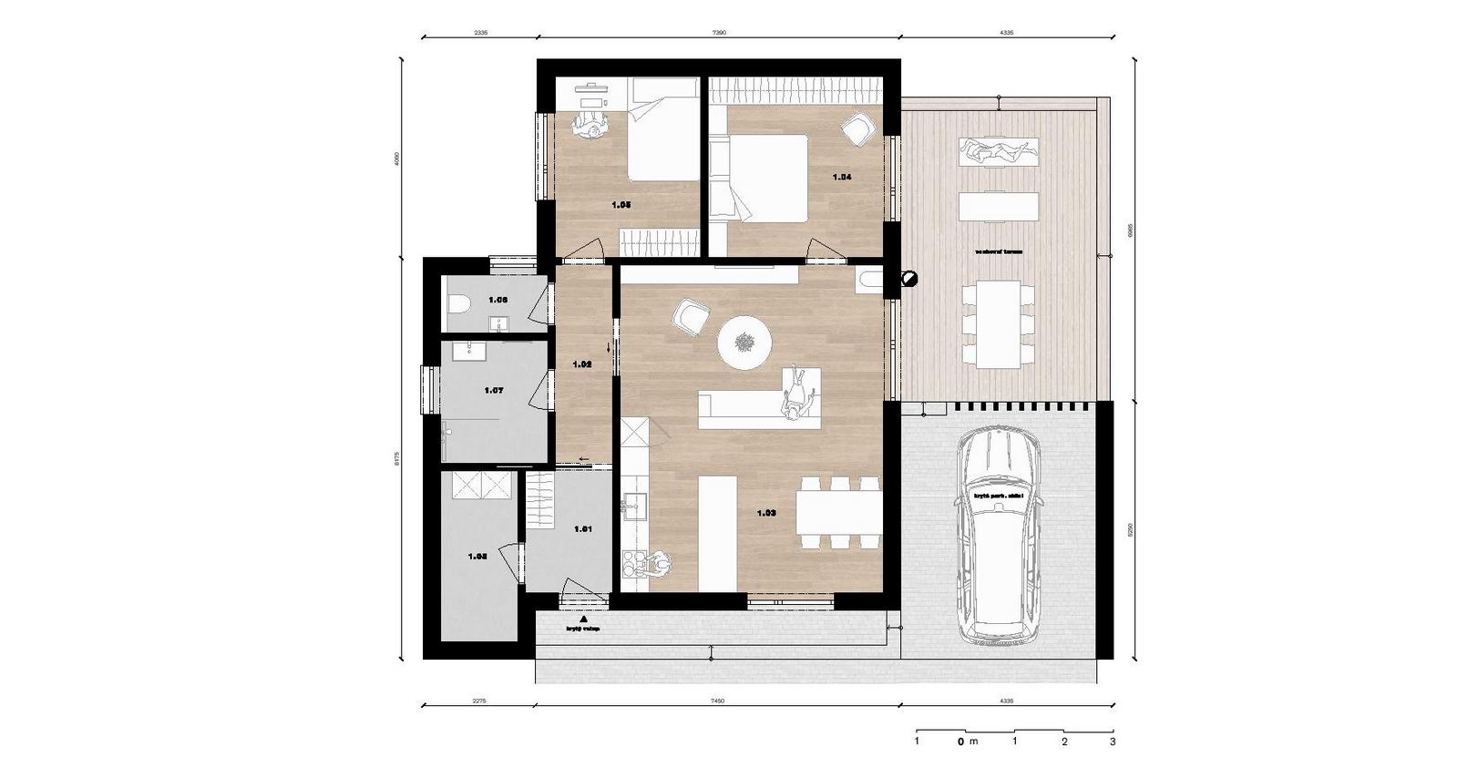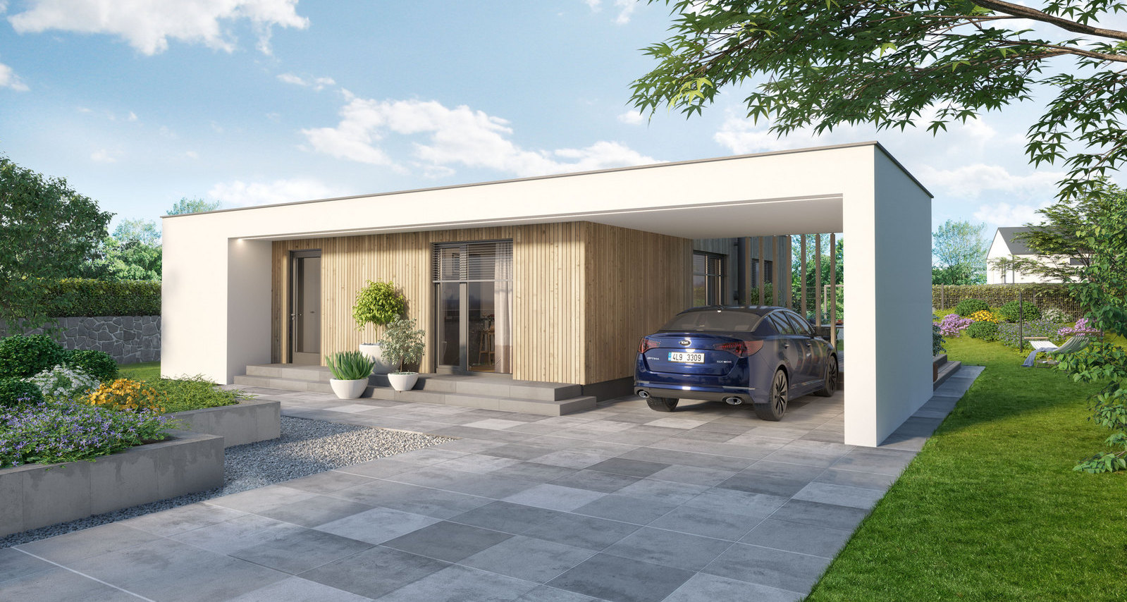 Jedná se o jednoduchý přízemní dům s plochou střechou, který je hmotově tvořen hlavní hmotou domu s obytnou částí a hmotou zastřešení vstupu s parkovacím stáním. V domě se nachází zádveří, technická místnost, hlavní obytná místnost, ložnice, pokoj, koupelna a toaleta. Na hlavní obytnou místnost a ložnici navazuje venkovní terasa.